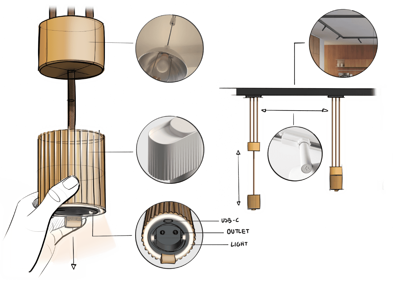 The initial solution fixated on a rigid table socket. Easy to use but always visible and disruptive. Inspiration from a counter-pendulum light led to a more blended design approach.