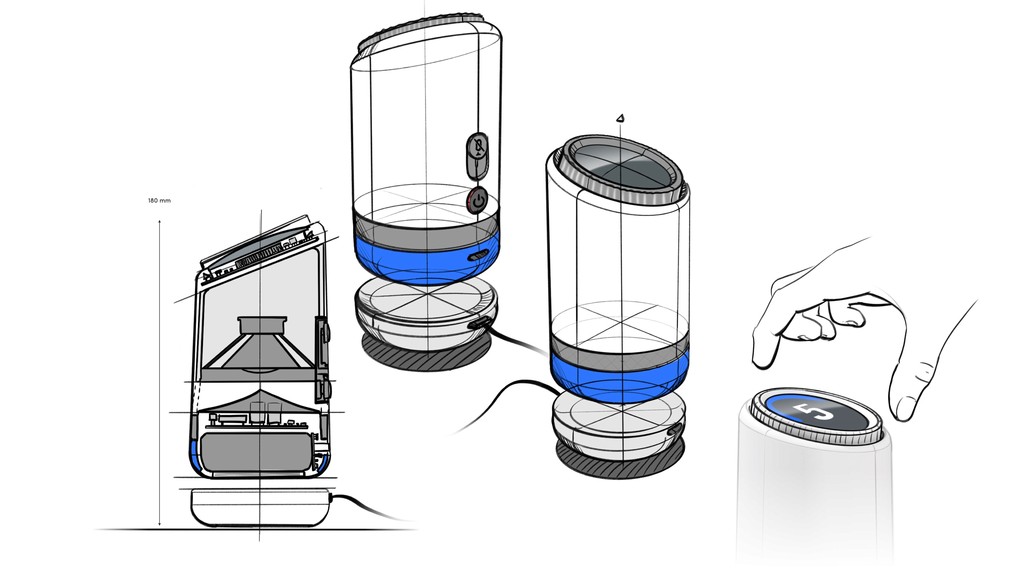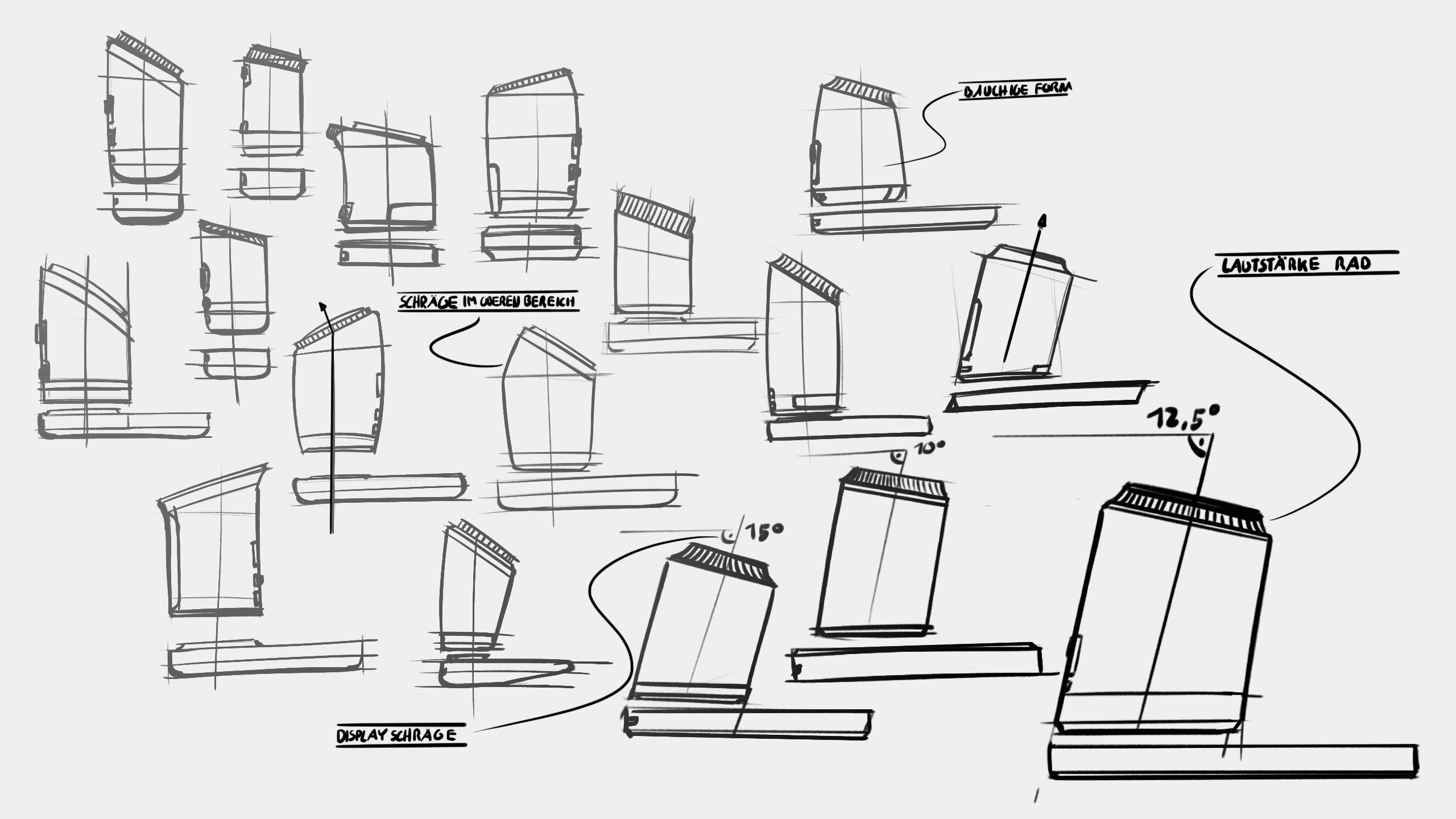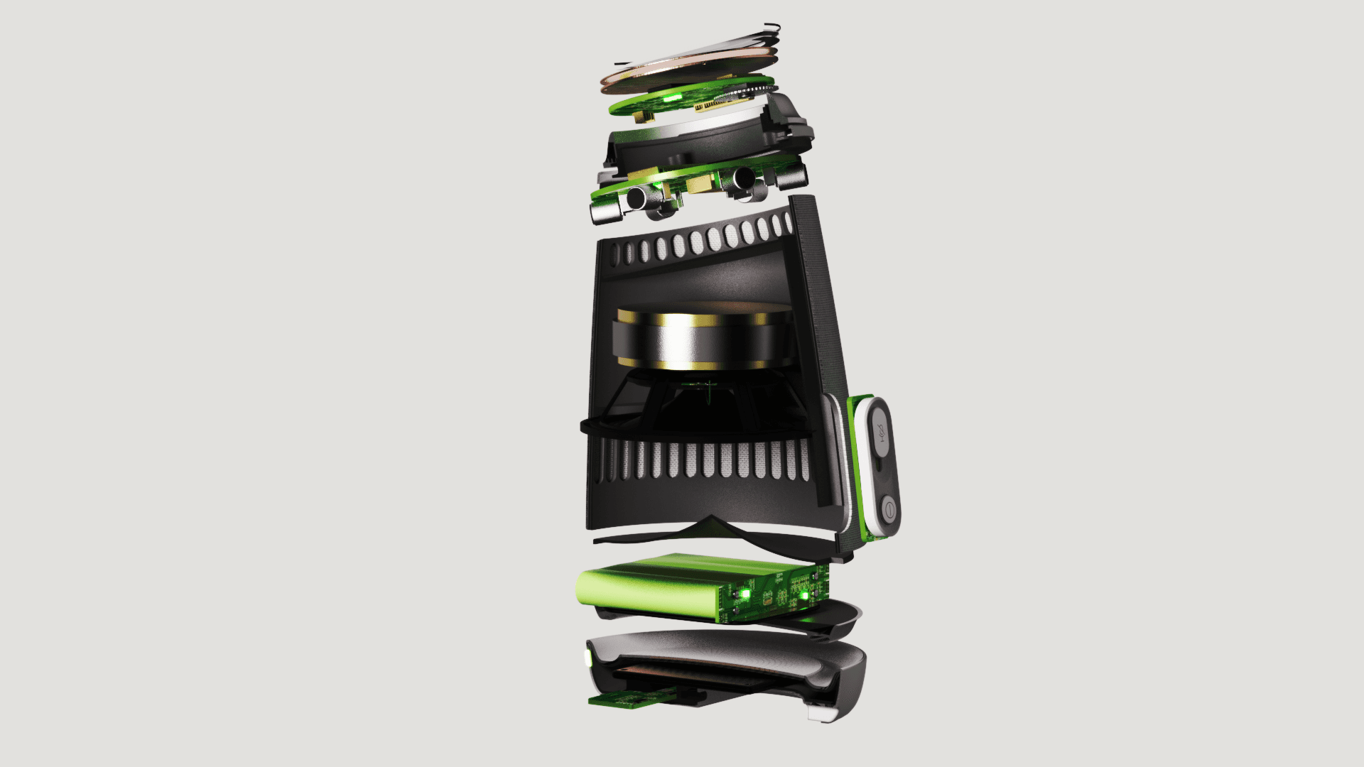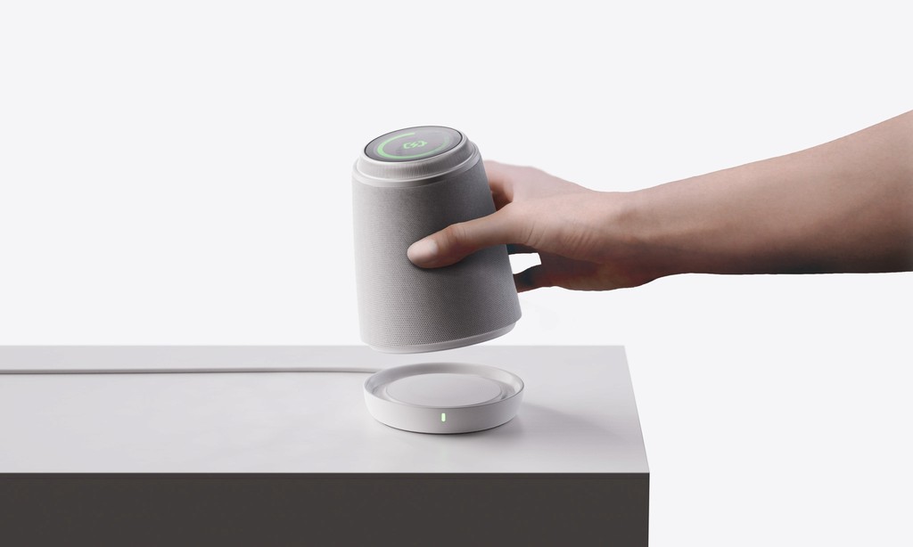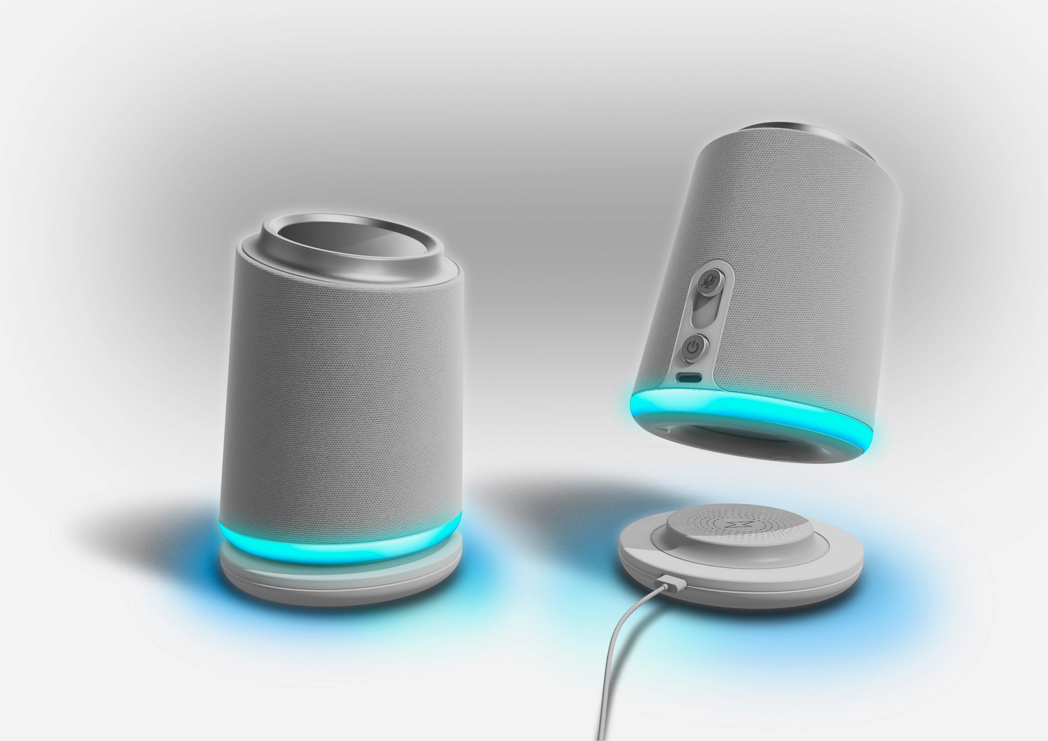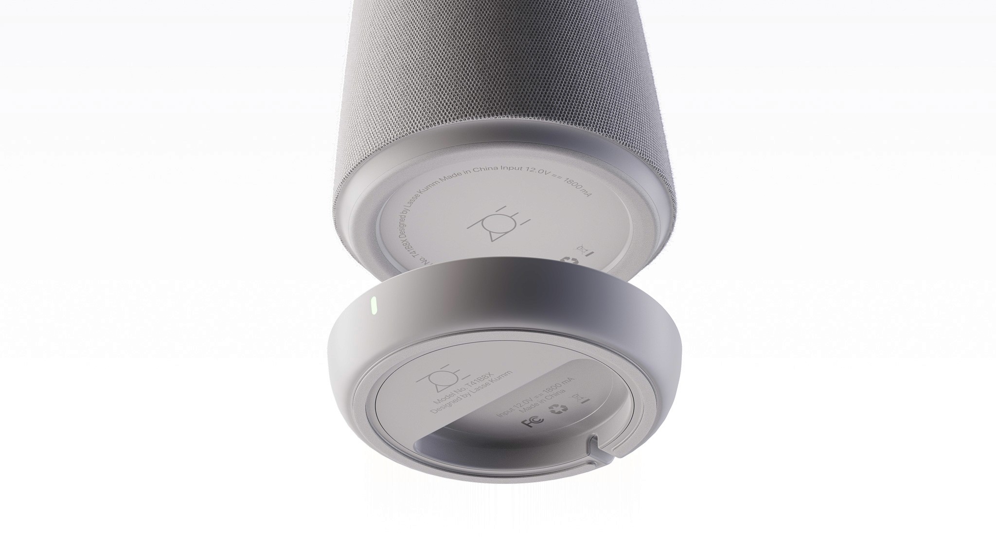 The seamless separation between the speaker and the charging station is the formative element of the design. The volume dial’s shape is repeated at the joint, forming a rounded base that vanishes into the charging station.