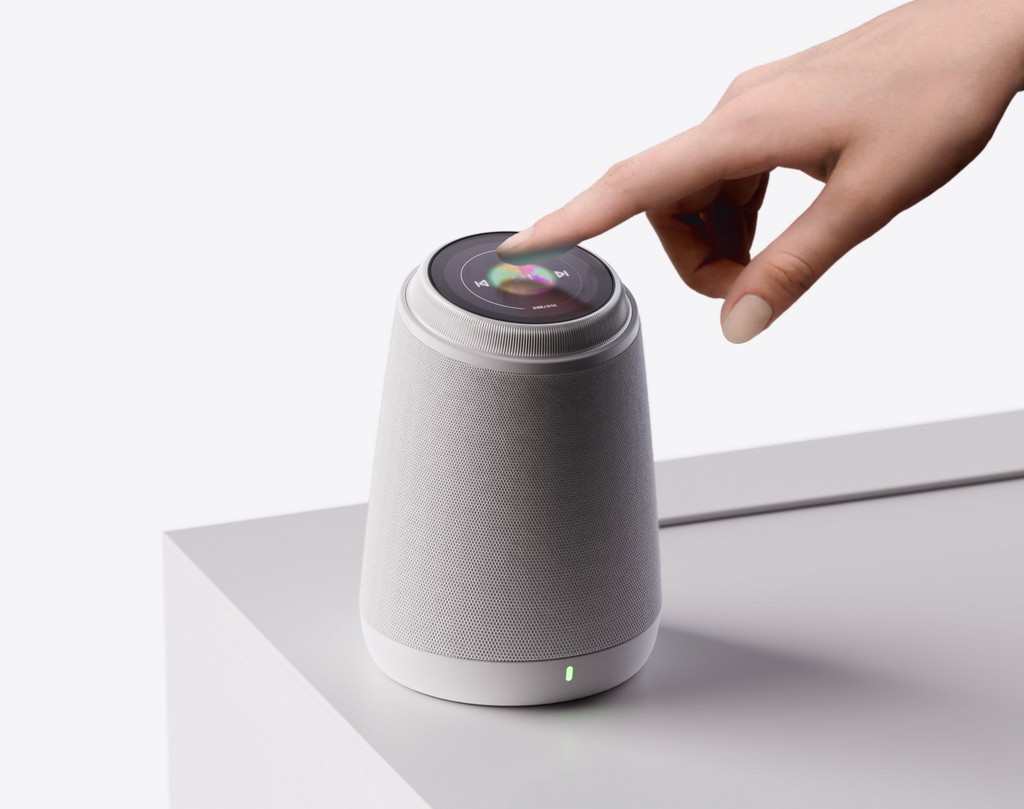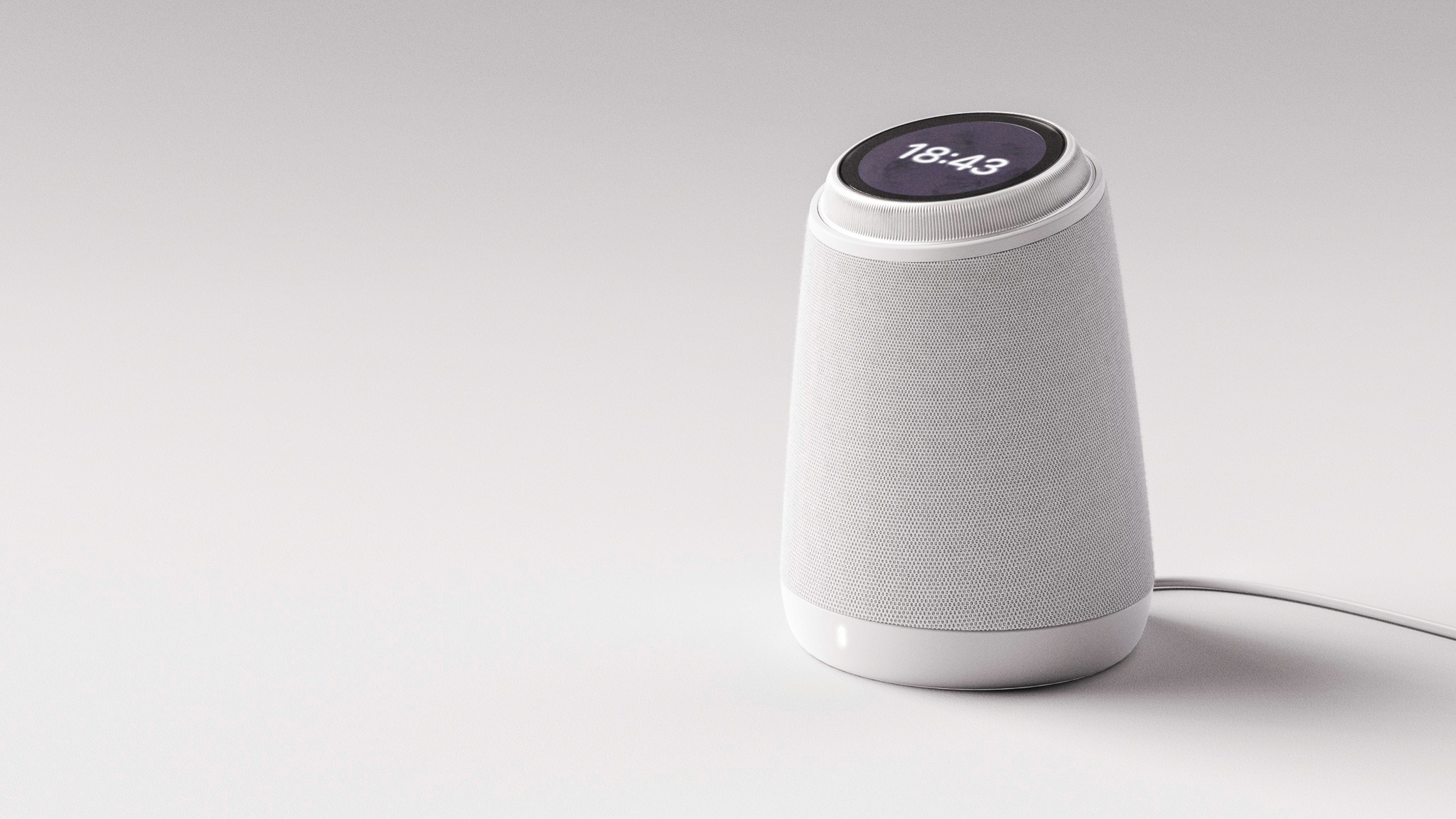 The smart speaker is operated via an OLED touch display, which changes its visual information depending on use.