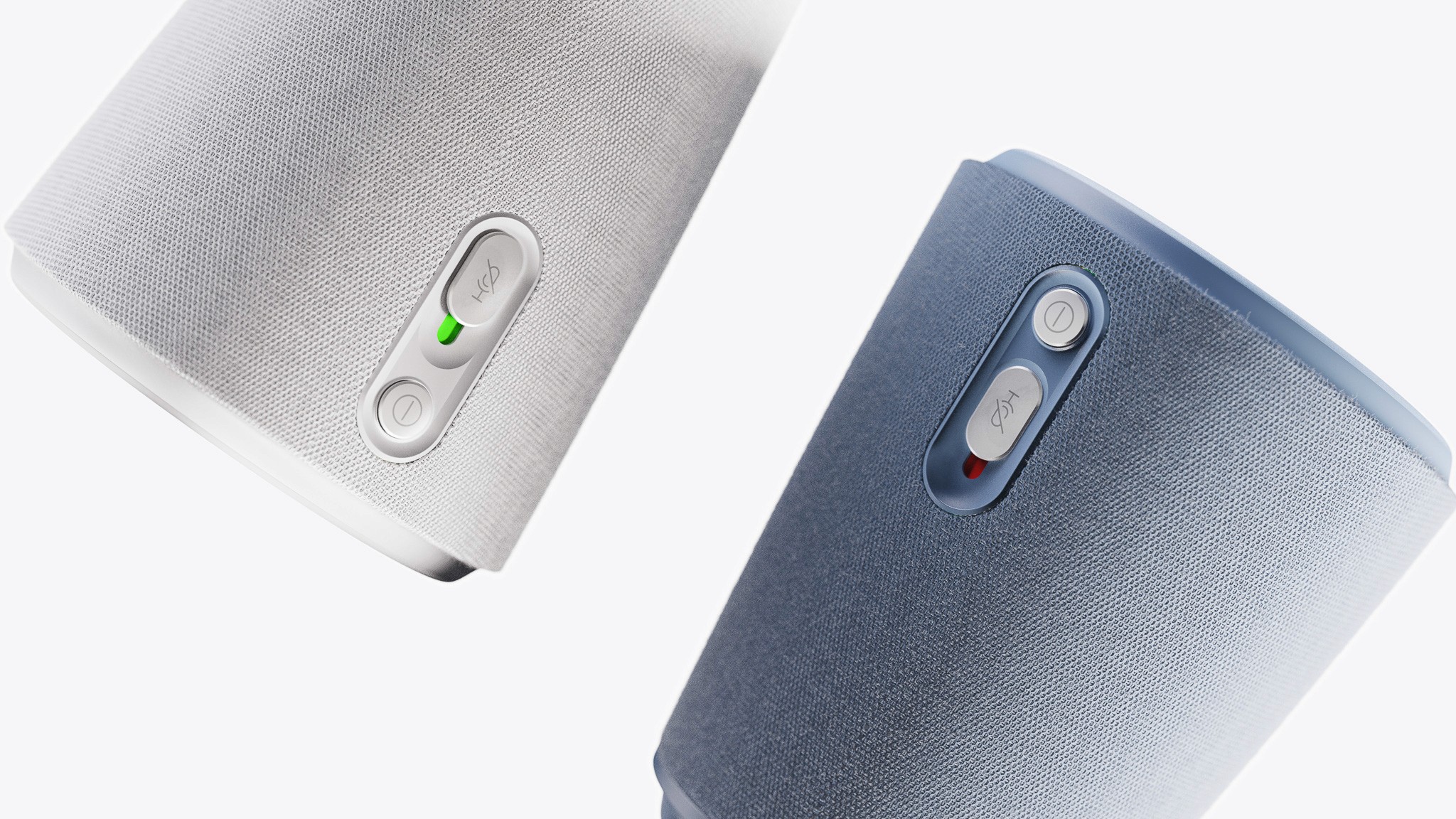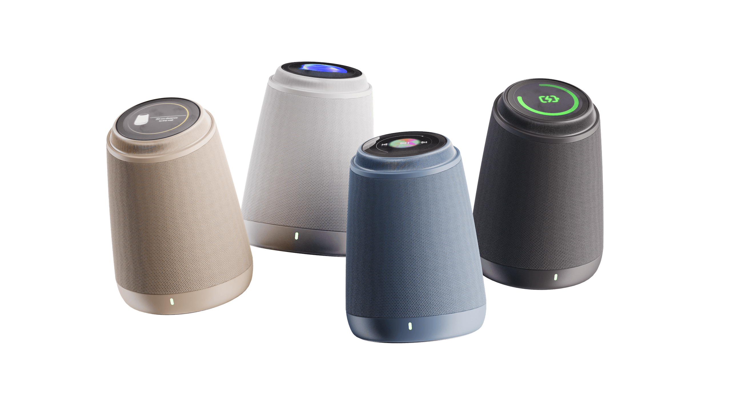 It features a volume dial and an adaptive angled touch display with haptic feedback for intuitive interaction. A mechanical mute switch and on/off button ensure privacy.